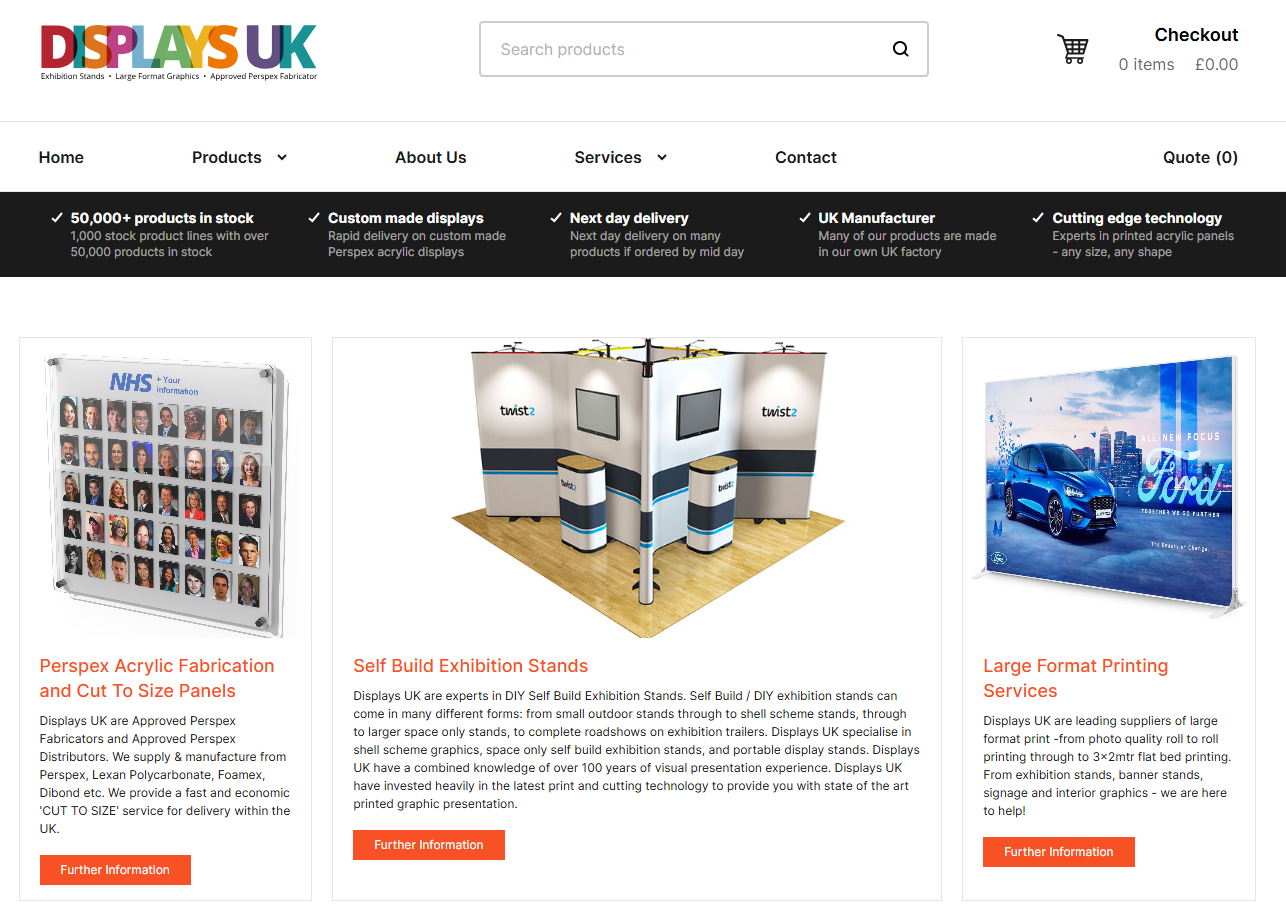 Displays UK are located in Christchurch, on the Hampshire / Dorset border. We are a proper 'bricks and mortar' manufacturing business not just another internet retailer. We have two retail showrooms, one features all of our gardening gifts range, and the other features kitchen splashbacks, secondary glazing, Perspex furniture and acrylic display cases to name just a few! We have over 30 years experience in manufacturing displays combining Perspex, Aluminium, and Wood. We manufacture museum displays, exhibition displays, retail & point of sale displays, estate agency displays, pharmaceutical displays, corporate front office displays, salon displays, waiting room displays, catering & hospitality displays. You will see many of our 'off the shelf' designs in our ecommerce section, but equally we are happy to make to your own custom designs.