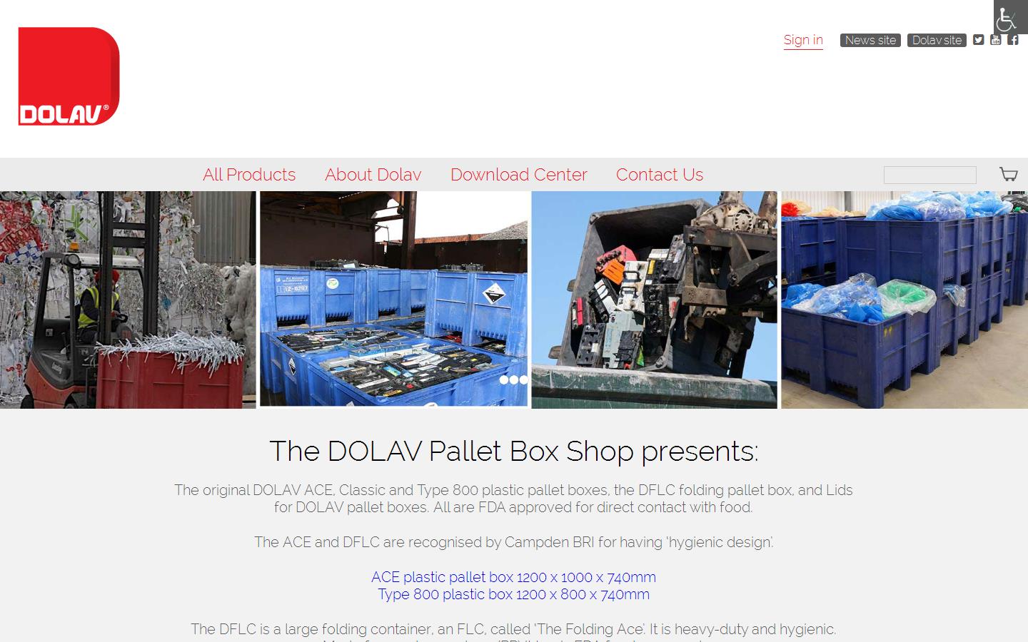 The original DOLAV ACE, Classic and Type 800 plastic pallet boxes, the DFLC folding pallet box, and Lids for DOLAV pallet boxes. All are FDA approved for direct contact with food.