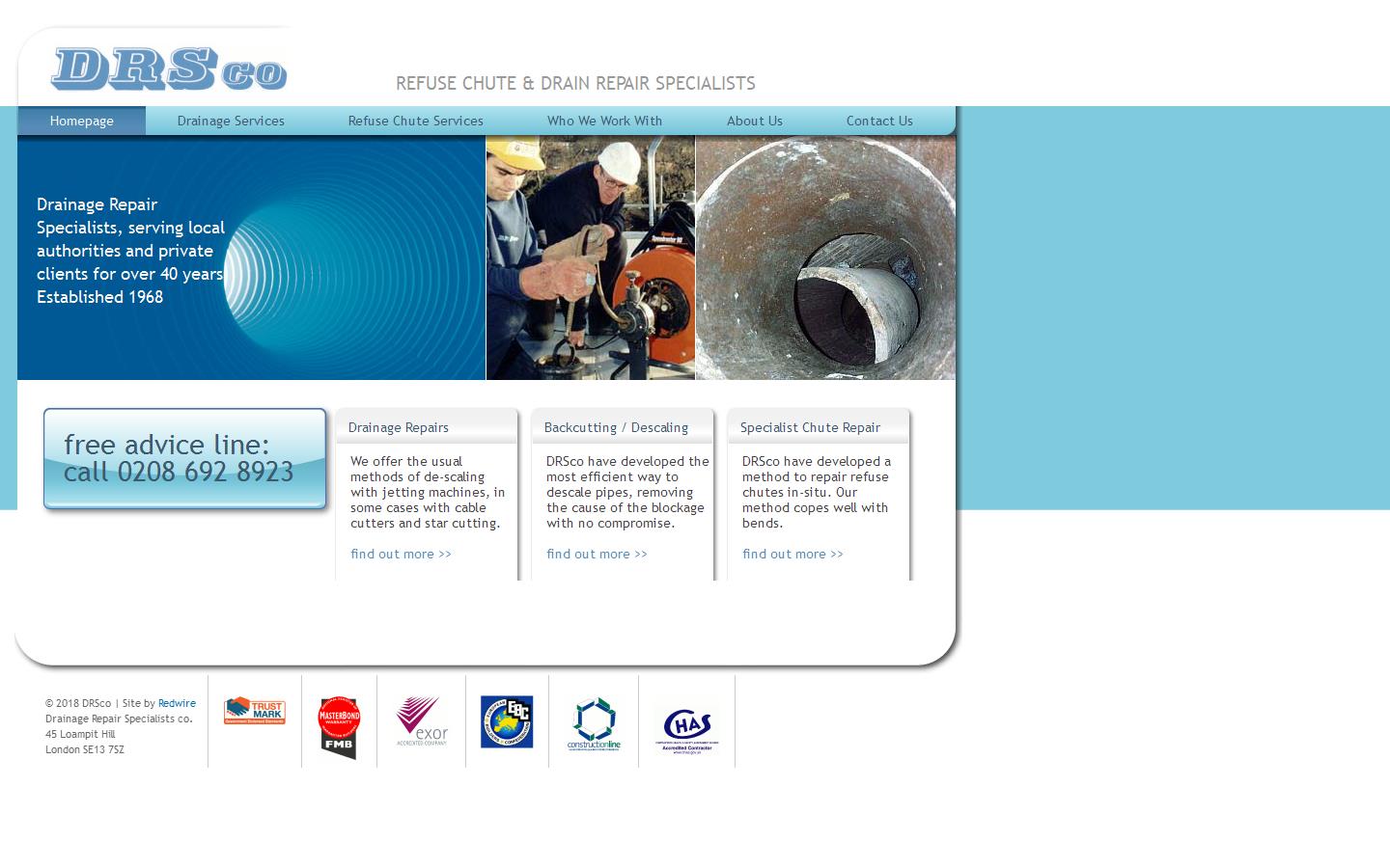 DRS Co - Drainage Repair Specialists Company deal with problem drains and chutes. We are normally called in to carry out a specialist repair service to either refuse chutes or waste stack pipes that need to be de-scaled. However we bring to any drainage or chute problem an experience gained over thirty years and passed on by regular internal training. Our backup for litigation or arbitration cases is well thought of.