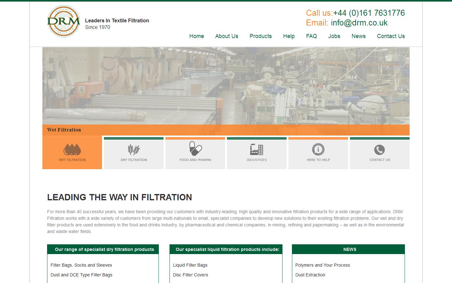 For more than 40 successful years, we have been providing our customers with industry-leading, high quality and innovative filtration products for a wide range of applications. DRM Filtration works with a wide variety of customers from large multi-nationals to small, specialist companies to develop new solutions to their existing filtration problems. Our wet and dry filter products are used extensively in the food and drinks industry, by pharmaceutical and chemical companies, in mining, refining and papermaking − as well as in the environmental and waste water fields.