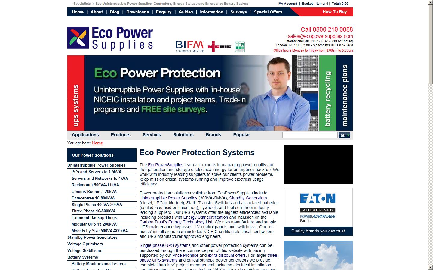 Eco Power Supplies is a UK supplier of critical eco power protection systems, backup uninterruptible power supplies (UPS systems), standby power generators and energy storage solutions. The company provides 24/7 services including maintenance plans and emergency response serving a wide range of customers including datacentres, industrial manufacturing plants, broadcasting, telecommunications, retail and similar IT applications.