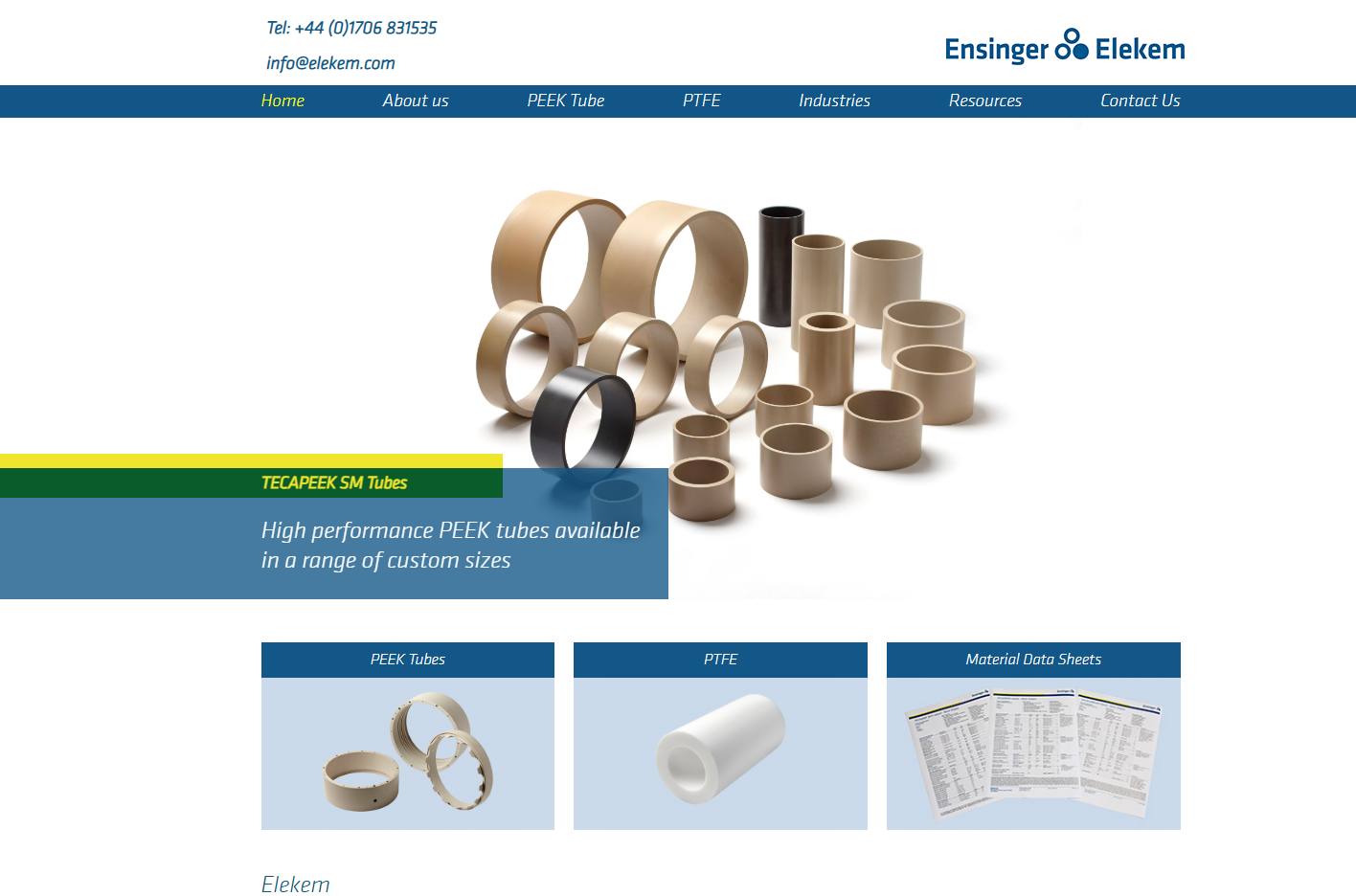 .The flexibility in Elekem’s PEEK and PTFE tube products enables them to cover a wide range of the most demanding industries throughout the world such as oil and gas, seals, food, hydraulic/fluid handling, pump manufacturing, chemical, transportation, electronics, aerospace and medical industries. Elekem’s policy is to provide the best possible service to their customers for both repeat and new product requirements.
