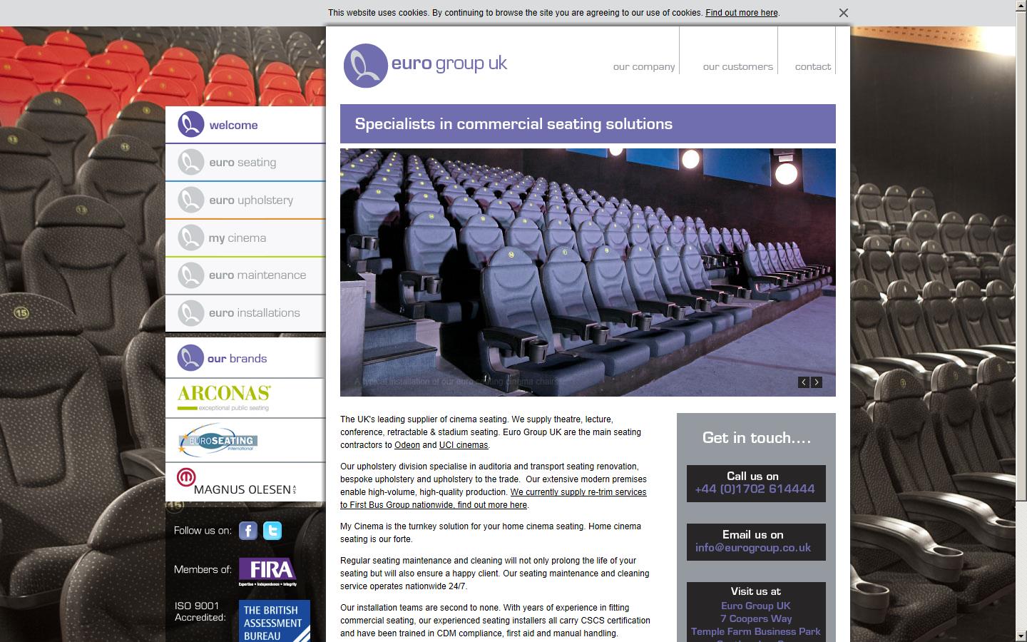Euro Group UK supply a range of seating for cinemas, auditoriums, stadiums, airports, public waiting areas, lecture halls, theatres, VIP, contract seating and other services including upholstery, installation and maintenance.