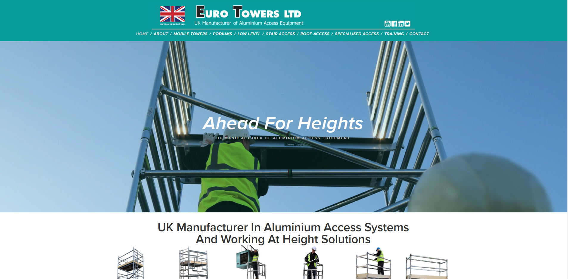 Euro Towers are a leading UK manufacturer of mobile Aluminium Access Scaffolding Towers, access equipment, providing solutions for commercial working at height and Low Level Folding Units and Podiums, to meet the requirements of both domestic and industrial users.