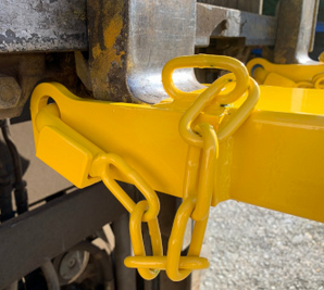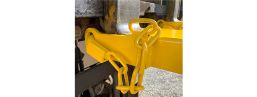 The Attachment mounts onto the Forklift's Fork and is secured in place behind the heel of the fork with a heel pin. The other end of the Attachment fits onto the Tow Ball on the Trailer.