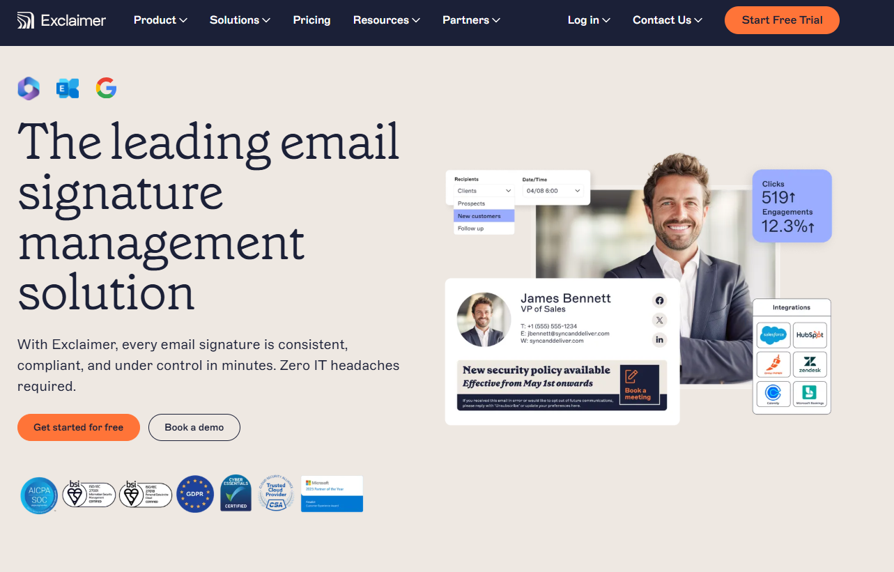 Exclaimer is the leading provider of email signature management solutions for Microsoft and Google email services. Its scalable cloud-based platform enables organizations to centrally manage and automate email signatures, ensuring regulatory compliance, operational efficiency, and brand consistency. Built for IT teams, Exclaimer simplifies administration by eliminating manual updates, reducing security risks, and maintaining full control over corporate email communications.