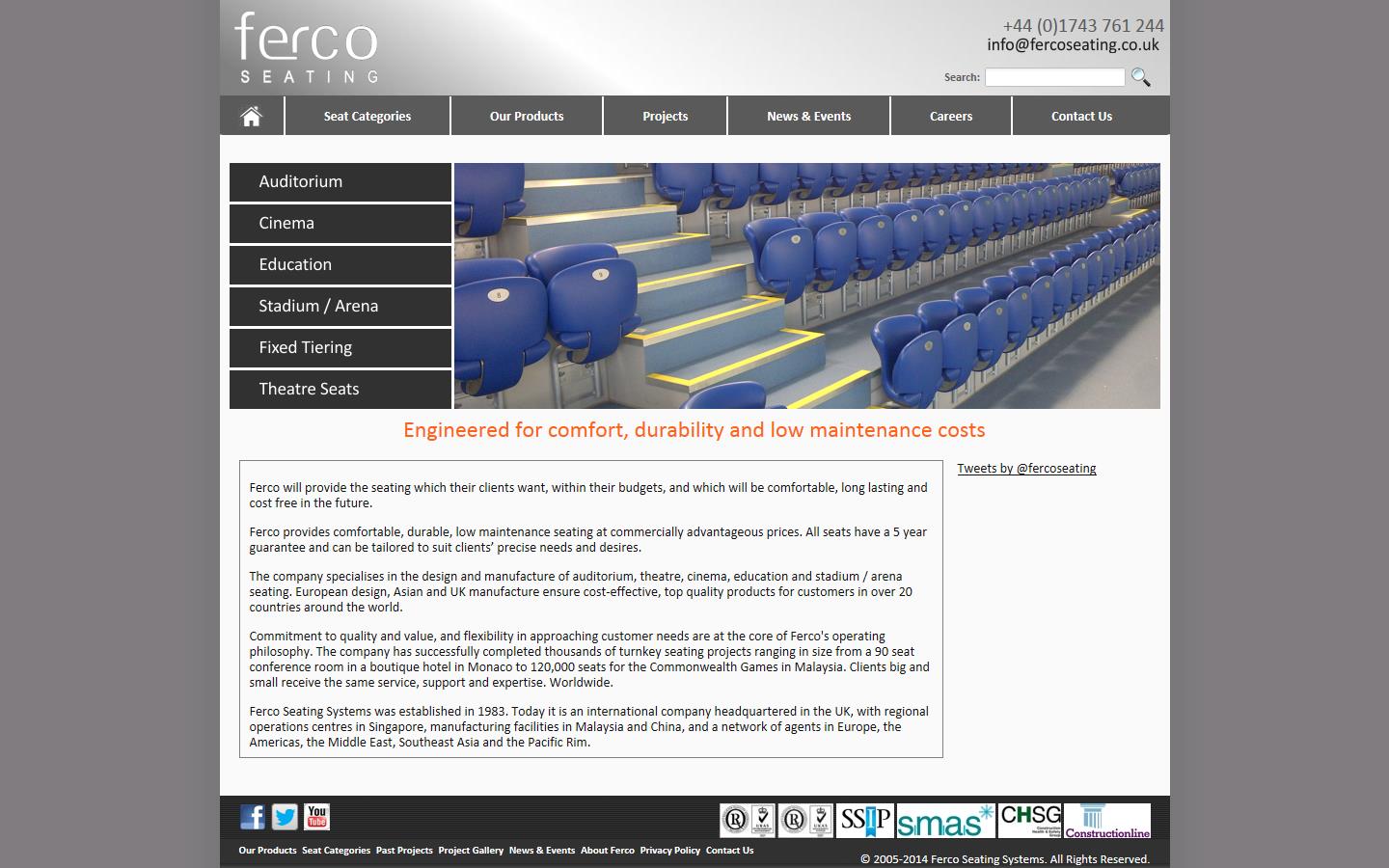 Established in 1983, Ferco Seating Systems is a leading international seating specialist with headquarters located in the UK. Specialising in the design and manufacturer of folding seating systems, Ferco offers an extremely wide choice of seats for all types of auditoria such as conferencing centres, sports venues and stadiums, theatres, cinemas, multi purpose halls and lecture rooms. The range includes not only a choice of design for each application but also a range of finishes to suit most budgets.