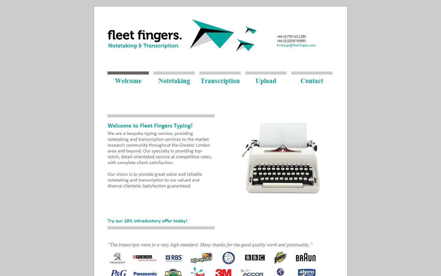Fleet Fingers know everything there is about high standard notetaking and transcription services, providing businesses with skilled typists giving 75wpm+. We''re all about giving the best service for competitive pricing and will offer 20% off as an introductory rate. Our services have been used by many reputable companies such as the BBC, RBS, Panasonic and many more.