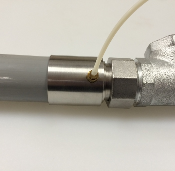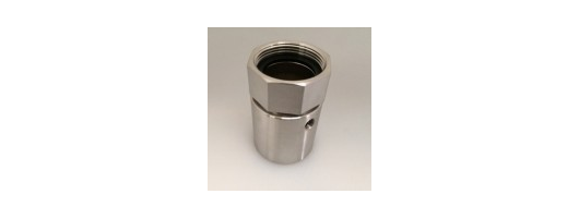 The stainless steel coupling with swivel nut is internally swaged to secure it to the pipework. Finished thread connect 1 1/2" NPSH including Viton Seal. Very easy to use simply cut the pipework to length, no requirement to remove the outer pipe jacket. Both primary and secondary pipe is swaged in a single action into the coupling. Test port allows access to the interstice for monitoring and leak detection. Uses standard SPC faceplate on coupling machine for swaging.