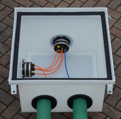 Manufactured from strong rotationally moulded polyethylene the chambers will not corrode. The riser can be easily cutdown to suit site burial deoths and the base is easily drilled to fit watertight ChamberTite duct boots and pipe glands. This maintains the watertightness of you chamber after fitting pipes and electrical connections. Once installed all equipment is accesible within the chamber for maintenance and inspection.
