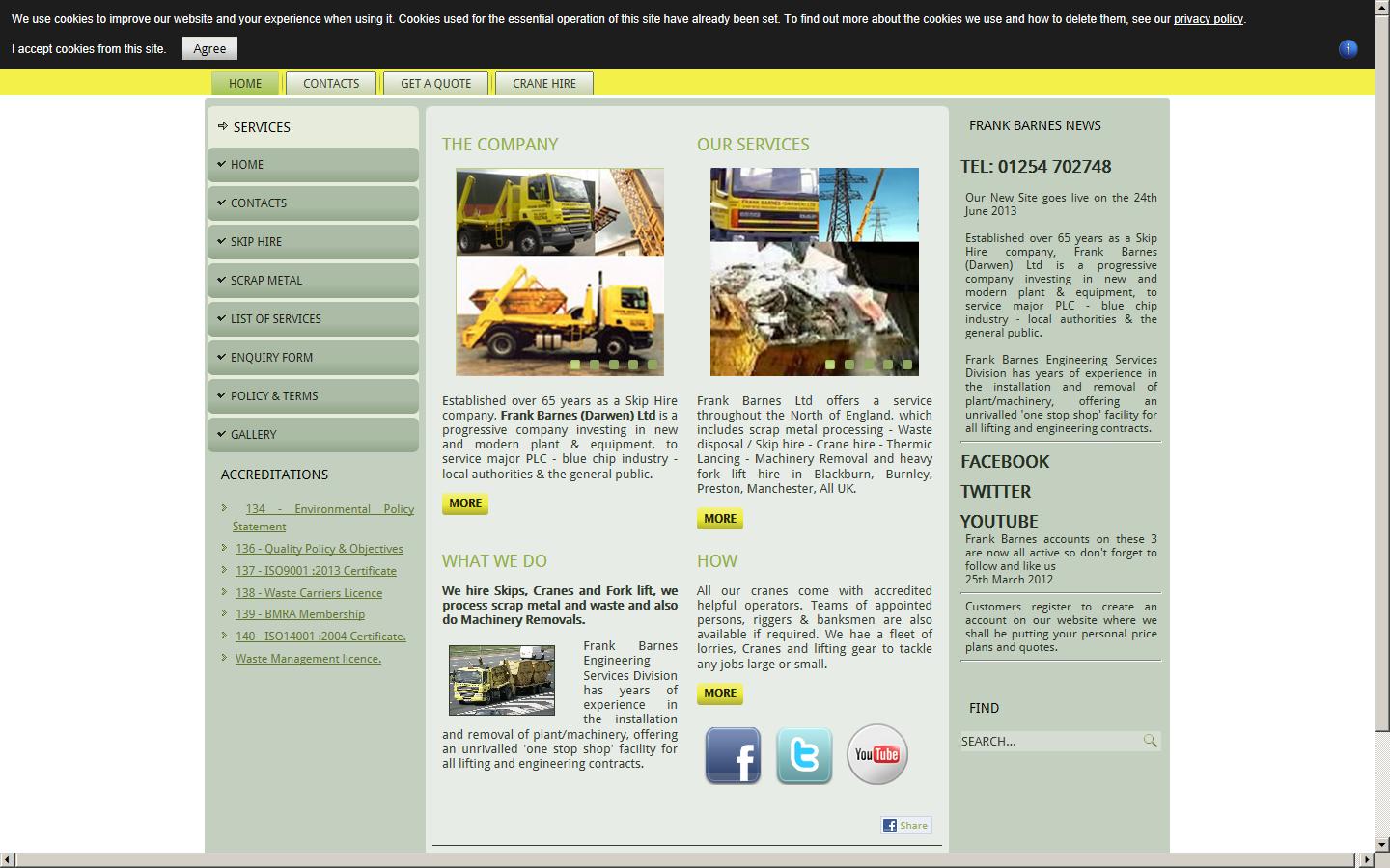 Established over 55 years Frank Barnes (Darwen) Ltd is a progressive company investing in new and modern plant ; equipment, to service major PLC - blue chip industry - local authoritie; the general public. The Company operates from two sites in the Lancashire area employing over 40 staff. As well as our main frame operations we also provide services for reusable steel stock holding - reusable tanks/vessels - electric motors & gearboxes etc.