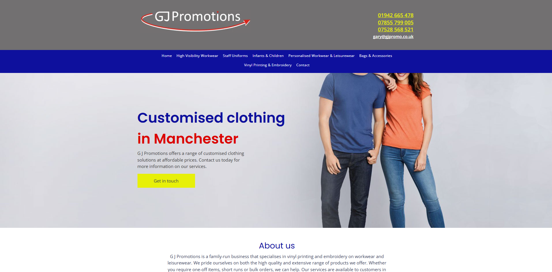 G J Promotions is a family-run business that specialises in vinyl printing and embroidery on workwear and leisurewear. We pride ourselves on both the high quality and extensive range of products we offer. Whether you require one-off items, short runs or bulk orders, we can help. Our services are available to customers in Manchester and the surrounding areas. Contact us for a free, no-obligation quote.
