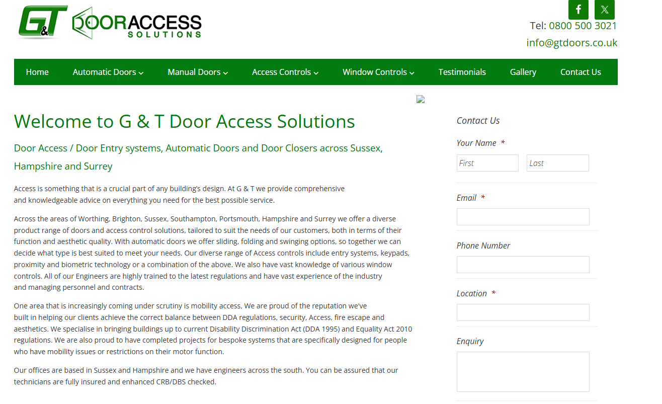 Across the areas of Worthing, Brighton, Sussex, Southampton, Portsmouth, Hampshire and Surrey we offer a diverse product range of doors and access control solutions, tailored to suit the needs of our customers, both in terms of their function and aesthetic quality. With automatic doors we offer sliding, folding and swinging options, so together we can decide what type is best suited to meet your needs. Our diverse range of Access controls include entry systems, keypads, proximity and biometric technology or a combination of the above. We also have vast knowledge of various window controls. All of our Engineers are highly trained to the latest regulations and have vast experience of the industry and managing personnel and contracts.