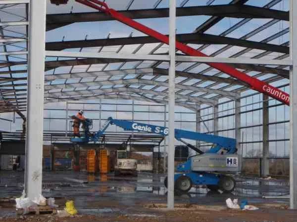 This was a complex web of metal in an ex Aircraft Hangar in Warwickshire which had suffered a significant fire. We cleaned and primed it with MCU Aluprime Spring 2009.