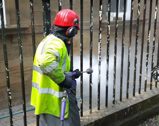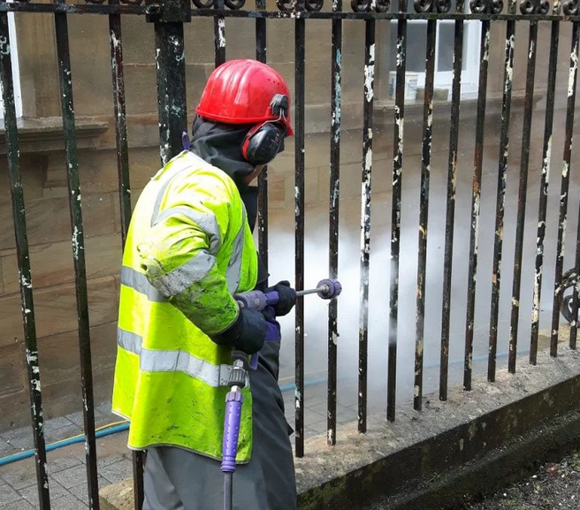 For more demanding jobs, higher-pressure water jetting is suitable. 500-bar water jets quickly and effectively remove paint from concrete and metal surfaces. One benefit for metalwork—such as railings or fire escapes—is reduced flash rusting compared to grit blasting. High-pressure water removes loose paint and rust while leaving well-adhered primers intact.