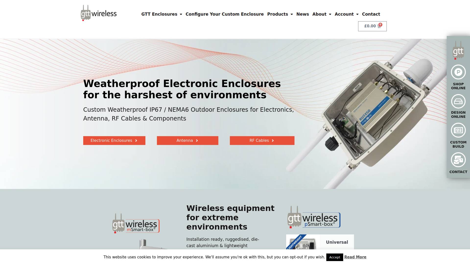 GTT Wireless designs and supplies IP67/NEMA6 outdoor electronic enclosures and antenna solutions for harsh environments. Our enclosures protect and connect custom electronics, IoT devices, Teltonika routers, modems, gateways, and Raspberry Pi boards. Choose installation-ready die-cast aluminium (mSmart-Box®) or lightweight polycarbonate (pSmart-Box®) models, integrating PoE, RF cables, ventilation, and connectors. Use our Online Configuration Tool for instant prototypes with 3D models, drawings, and full BOM. External or embedded antennas, no minimum order, fast delivery, and expert advice on 4G/5G, Wi-Fi, LoRa, and GPS. Trusted for carrier-grade, project-critical durability and signal performance. Buy or configure at gttwireless.com.