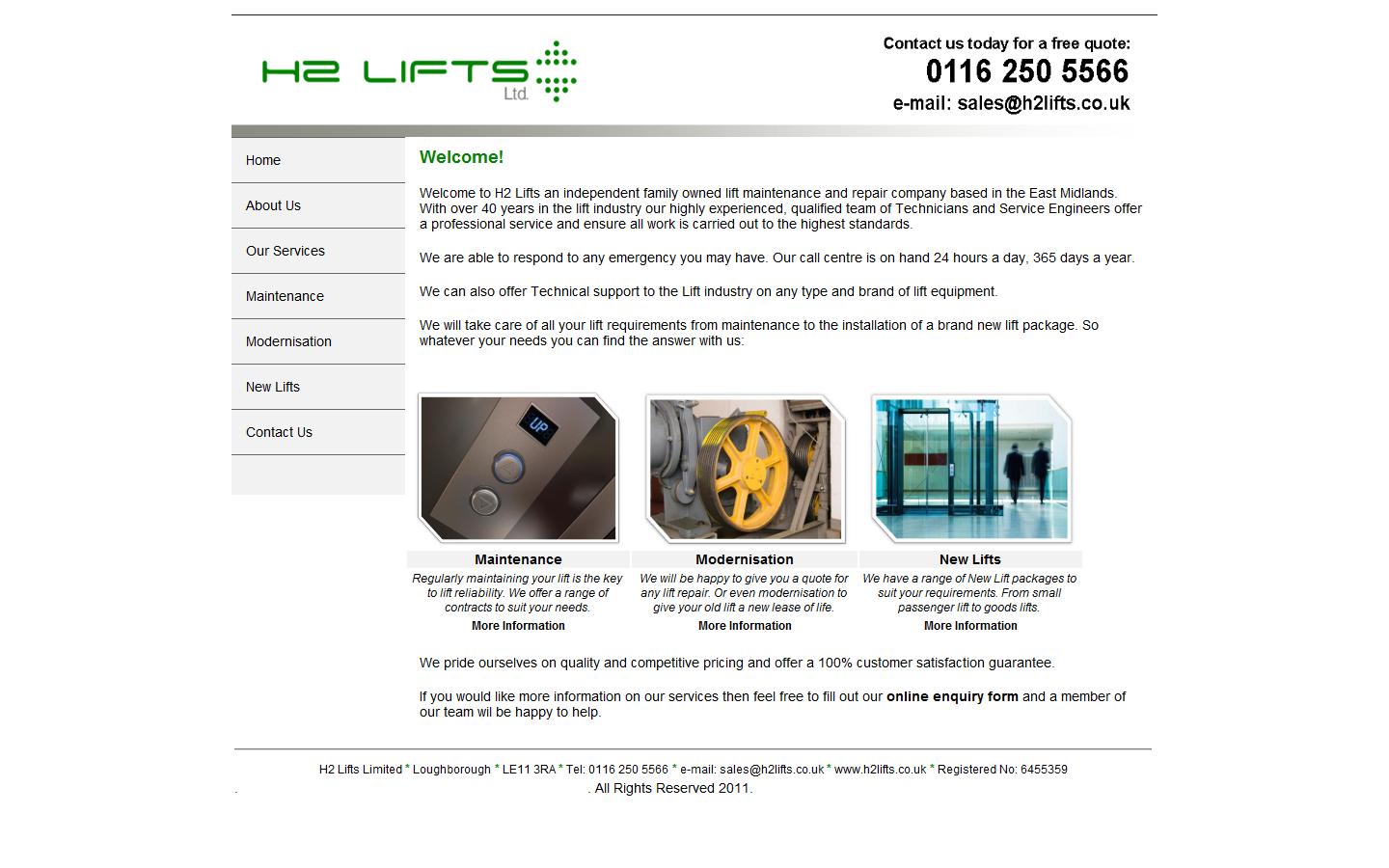 Welcome to H2 Lifts an independent family owned lift maintenance and repair company based in the East Midlands. With over 40 years in the lift industry our highly experienced, qualified team of Technicians and Service Engineers offer a professional service and ensure all work is carried out to the highest standards.