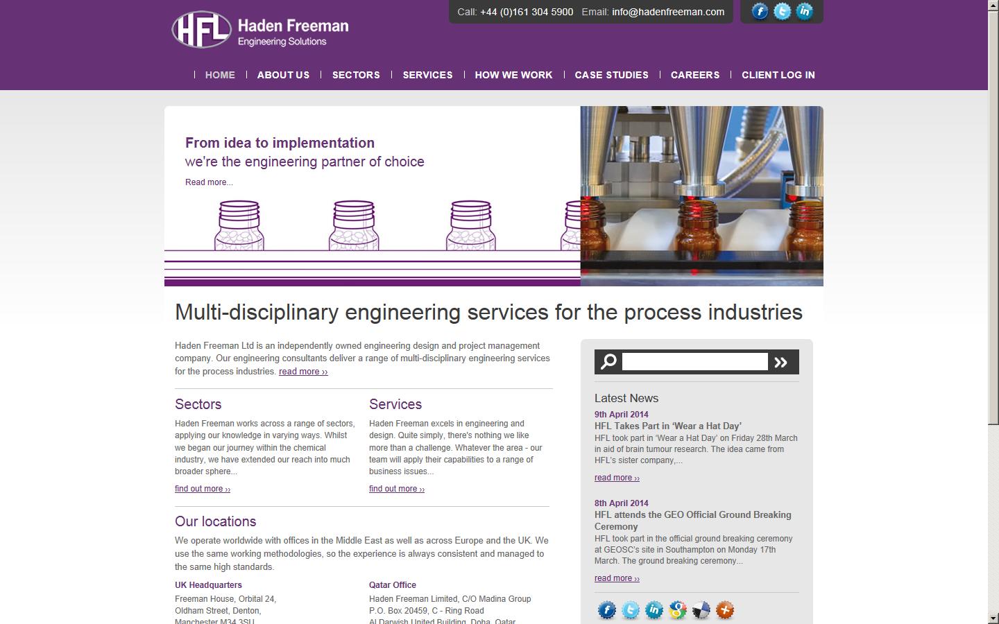 Haden Freeman Ltd is an independently owned engineering design and project management company. Our engineering consultants deliver a range of multi-disciplinary engineering services for the process industries. Our range of specialist services extends from front-end engineering design (FEED) studies through to full turnkey solutions. Our clients include leading organisations in: chemical; pharmaceutical; healthcare; energy; environmental; waste; resource efficiency; food and beverage; oil and gas, and other manufacturing industries, globally.