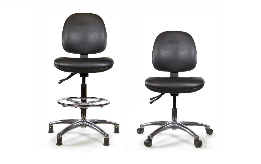 Upholstered in black, soft, easy to clean vinyl with anti-microbial and conductive properties. Available in two sizes, a high chair featuring ESD glides and a foot ring, or a low chair on ESD castors, with the choice of either brake loaded or soft tyre castors depending on the work area.