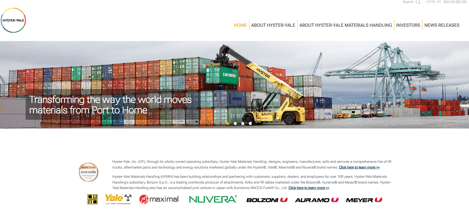 Hyster-Yale Materials Handling (HYMH) has been building relationships and partnering with customers, suppliers, dealers, and employees for over 100 years. Hyster-Yale Materials Handling’s subsidiary, Bolzoni S.p.A., is a leading worldwide producer of attachments, forks and lift tables marketed under the Bolzoni®, Auramo® and Meyer® brand names. Hyster-Yale Materials Handling also has an unconsolidated joint venture in Japan with Sumitomo NACCO Forklift Co., Ltd.