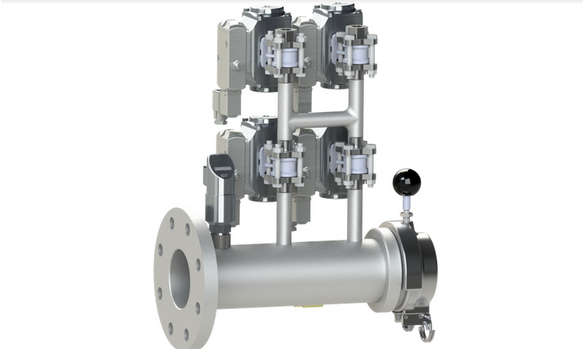 This is the first manifold which allows different nominal diameters to be combined in a single design. For example, a piggable DN 50 pipeline can be filled with product next to a DN 100 pipeline and can then be pigged.