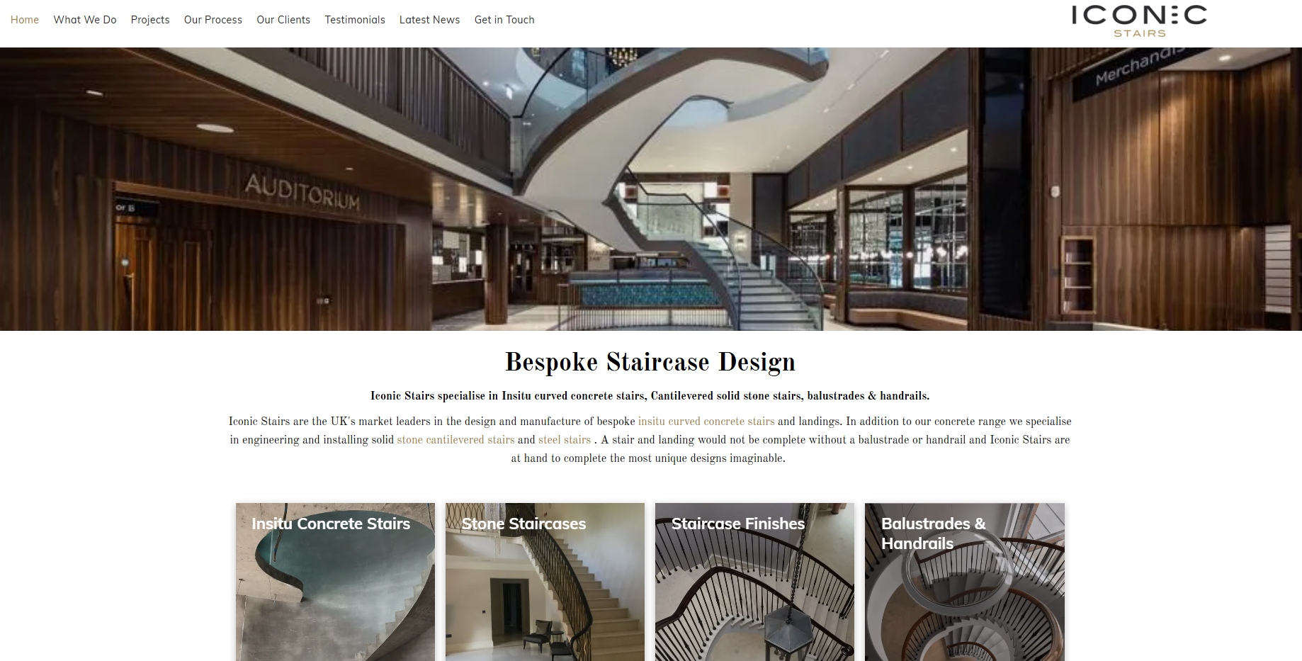 Iconic Stairs are the UK's market leaders in the design and manufacture of bespoke insitu curved concrete stairs and landings. In addition to our concrete range we specialise in engineering and installing solid stone cantilevered stairs and steel stairs . A stair and landing would not be complete without a balustrade or handrail and Iconic Stairs are at hand to complete the most unique designs imaginable.