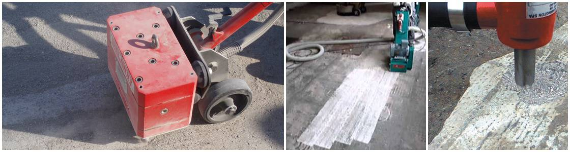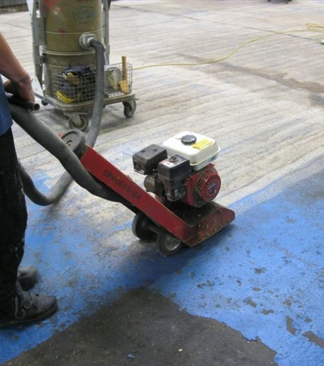 This floor preparation is the standard preparatory technique for texturing concrete and asphalt or for removing paint, rusted material, grease, iced deposits, lined markings, deeply encrusted coatings, latex, adhesives, former coatings and hi-spots, plus concrete laitance. It is also good for removing waterproof membranes from locations such as car parks and other hard standing areas. Scabbling is a destructive process and is ideal for preparing large areas prior to the application of screeds.
