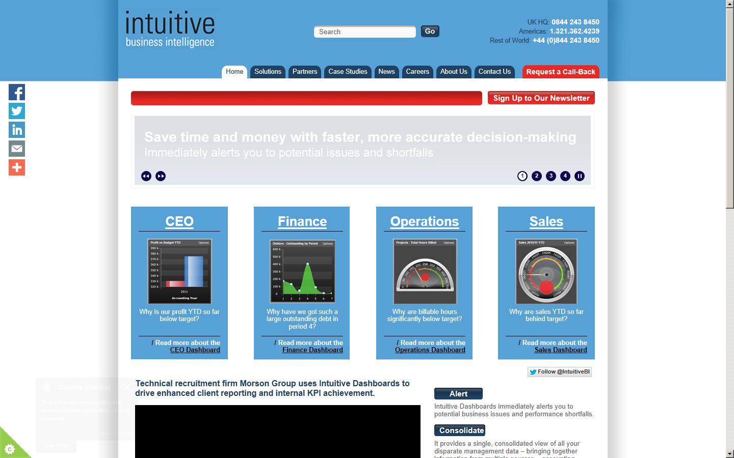 Intuitive Business Intelligence is a provider of business dashboard software. The company has developed its own dashboard software that pulls data from multiple sources into easily interpretable visual dashboards. Intuitive Business Intelligence is able to pull data from multiple Finance, CRM & ERP packages and present data in a format specified by each specific user.