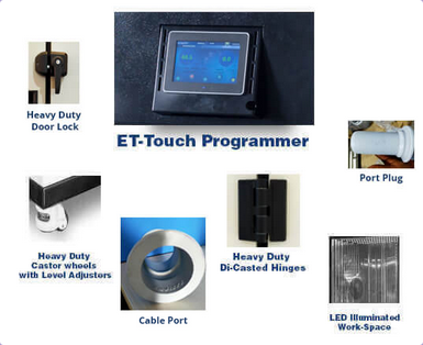 The walk-in/drive-in chambers can be supplied with temperature ranges of -35°C to +150°C or -65°C to +150°C with an optional humidity range of 20% to 95%RH. The chambers are fitted with the ET-Touch screen colour controller for programming and monitoring the set conditions inside the walk-in environmental chambers.