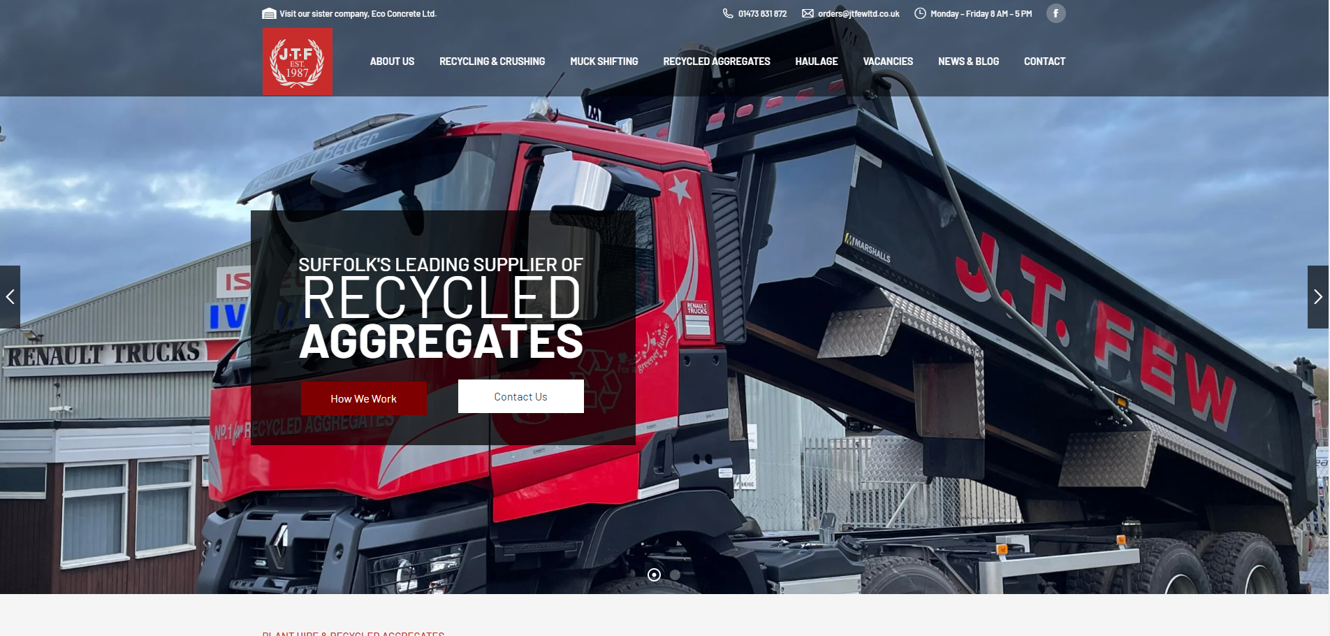 J.T.Few is the building and construction industry’s preferred partner for Plant Hire, Recycled Aggregates and Recycled Materials throughout East Anglia. Providing an efficient, reliable, and unparalleled service to building and construction companies on projects of all sizes.