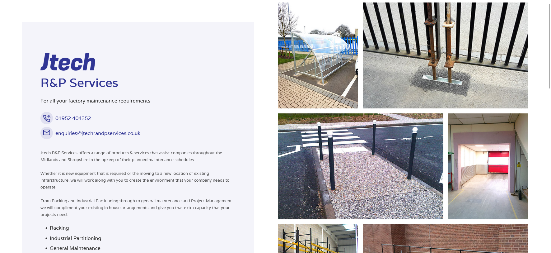 Jtech R&P Services provides a racking, partitioning and shelving service for all types of industrial applications. Alongside these items are a range of other products often used in these industries such as bike and smoking shelters, bollards, industrial mirrors, FR column cladding, and notice boards as well heavy duty ducting to protect site services.