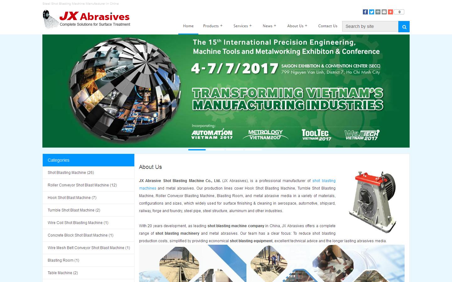JX Shot Blasting Machine Manufacturer Co., Ltd.(JX Abrasives) is specialized manufacturer of Roller Conveyor Shot Blasting Machine; Hook Shot Blasting Machine; Tumble Shot Blasting Machine; Table Machine; Blasting Room; Steel Shot; Steel Grit; Cut Wire Shot. These products have a lot of materials, configurations, and sizes that can meet all kinds of requirements. Our products widely applied in the aerospace, automotive, shipyard, railway, forge and foundry, pipe, steel structure, aluminum and other industries for surface finishing.For more detailed information, please visit: http://www.jxabrasives.com