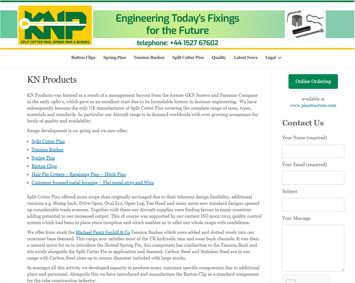 KN Products was formed as a result of a management buyout from the former GKN Screws and Fastener Company in the early 1980’s, which gave us an excellent start due to its formidable history in fastener engineering. We have subsequently become the only UK manufacturer of Split Cotter Pins covering the complete range of sizes, types, materials and standards. In particular our Aircraft range is in demand worldwide with ever growing acceptance for levels of quality and availability.