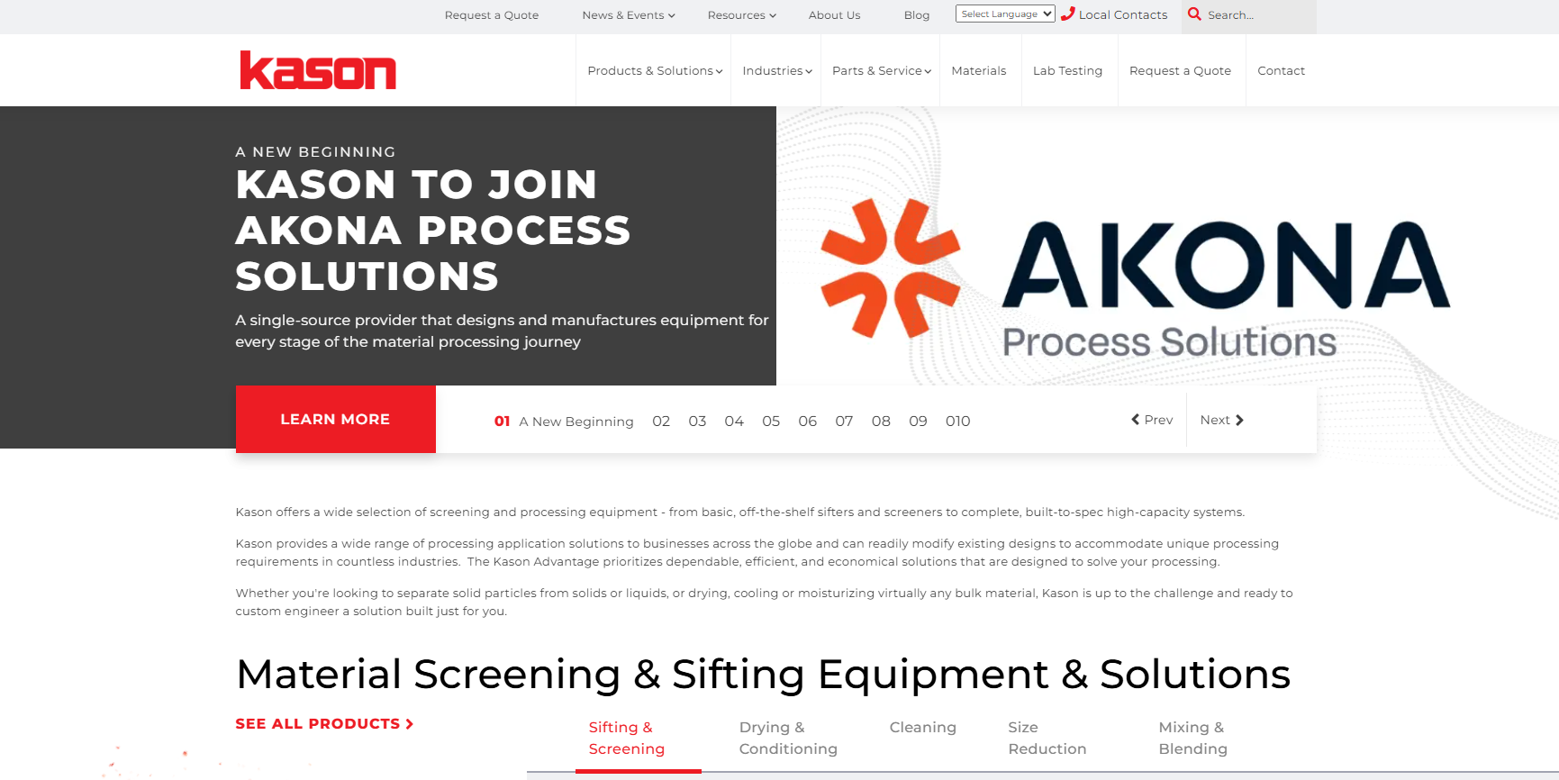 Kason's worldwide compliance with the most stringent safety, quality and sanitary standards and regulations, as well as our nearly 50 years of innovative design and vast process experience makes Kason the leader in the manufacturing of screening and processing equipment. Whether your application is simple or complex, low or high capacity, sanitary or industrial, you will find the specialized equipment and the application expertise you need for top performance at Kason.