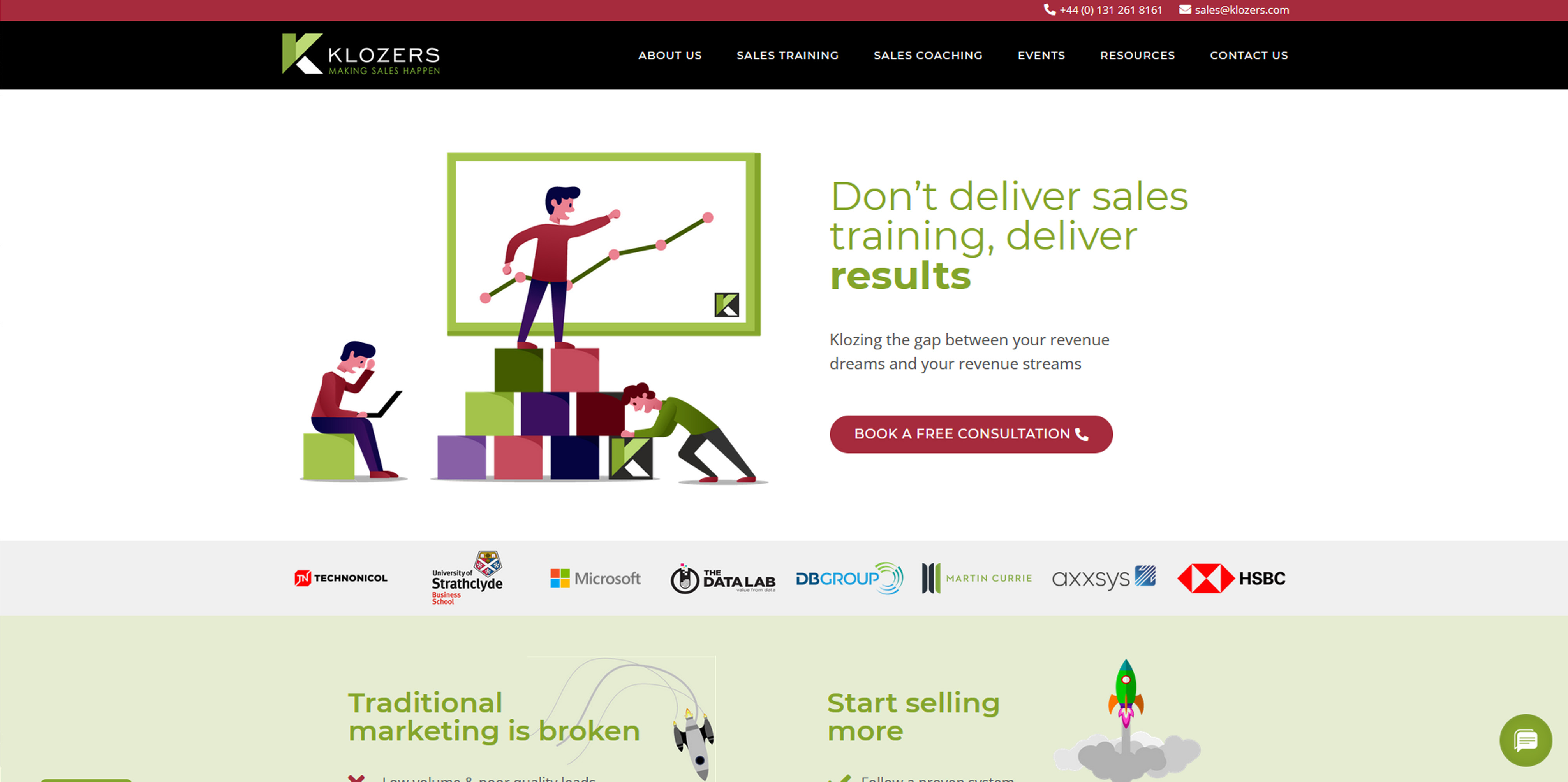 Some of our main services here at Klozers include SaaS sales training courses, consultative selling skills training courses, key account management training, sales management training courses, telesales training courses, enterprise sales training, bespoke sales training, B2B lead generation courses, executive sales coaching, sales performance coaching and more. We have worked with leading UK brands such as Technonicol, University of Strathclyde, Microsoft, The Data Lab, DB Group, Martin Currie, Axxys, HSBC and various others.