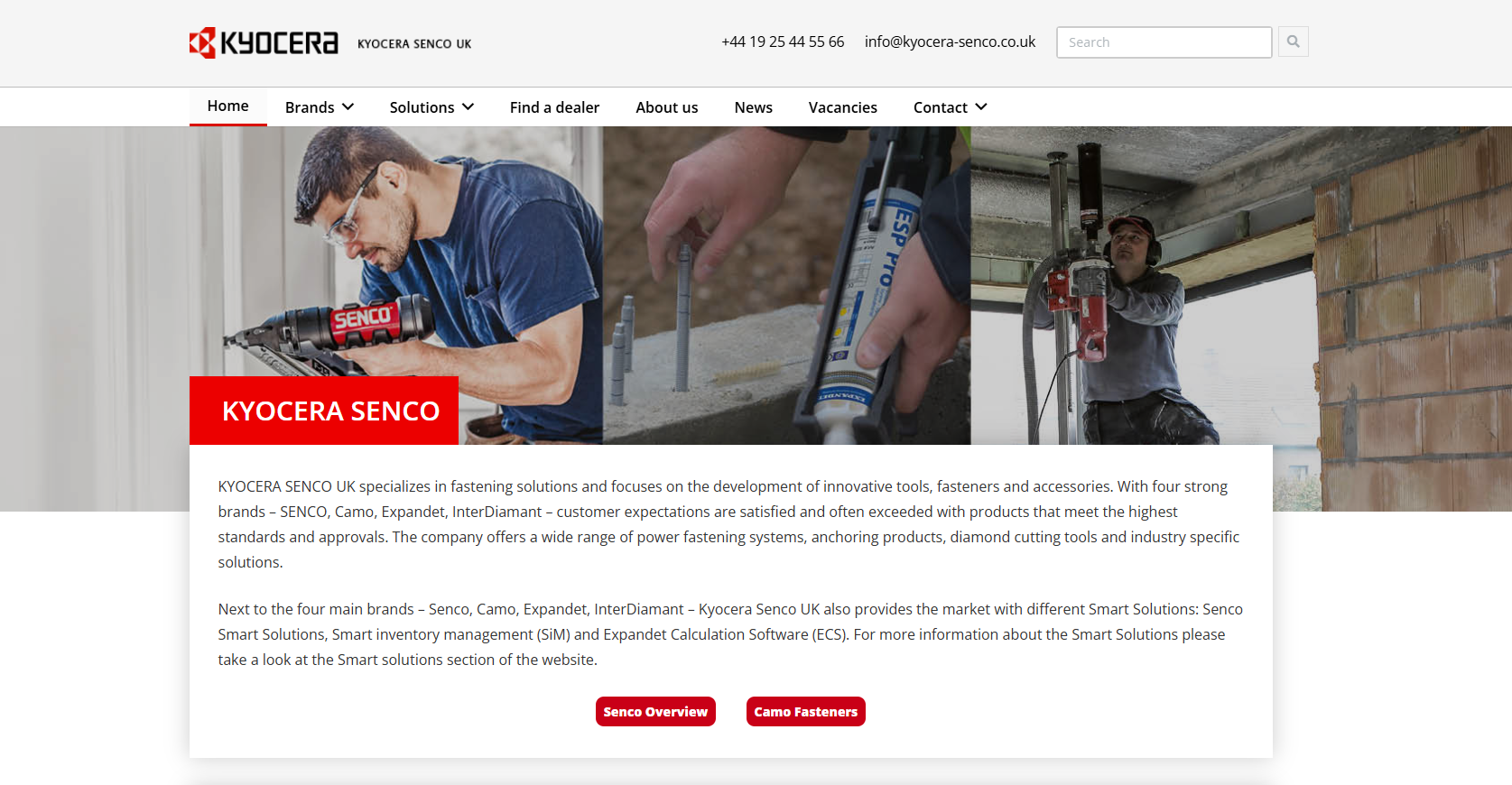 KYOCERA SENCO UK specializes in fastening solutions and focuses on the development of innovative tools, fasteners and accessories. With four strong brands – SENCO, Camo, Expandet, InterDiamant – customer expectations are satisfied and often exceeded with products that meet the highest standards and approvals. The company offers a wide range of power fastening systems, anchoring products, diamond cutting tools and industry specific solutions.