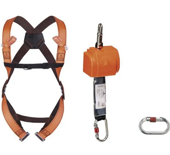 Fall arrest harness: Polyester straps. Fall arrest with automatic callback: Plastic housing, polyester strap. Carabiner: Steel.