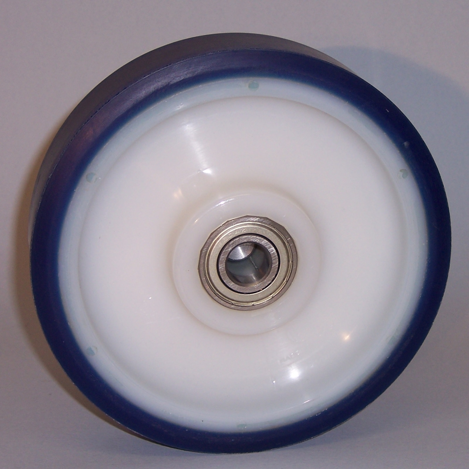 Wheels with cast soft polyurethane coating 87 Sh.A on polyamide 6 center.