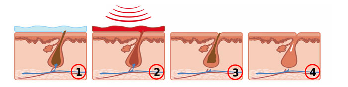 Light pulses are absorbed by the melanin contained in the hair provoking a sudden rise in temperature which permanently inhibits hair growth