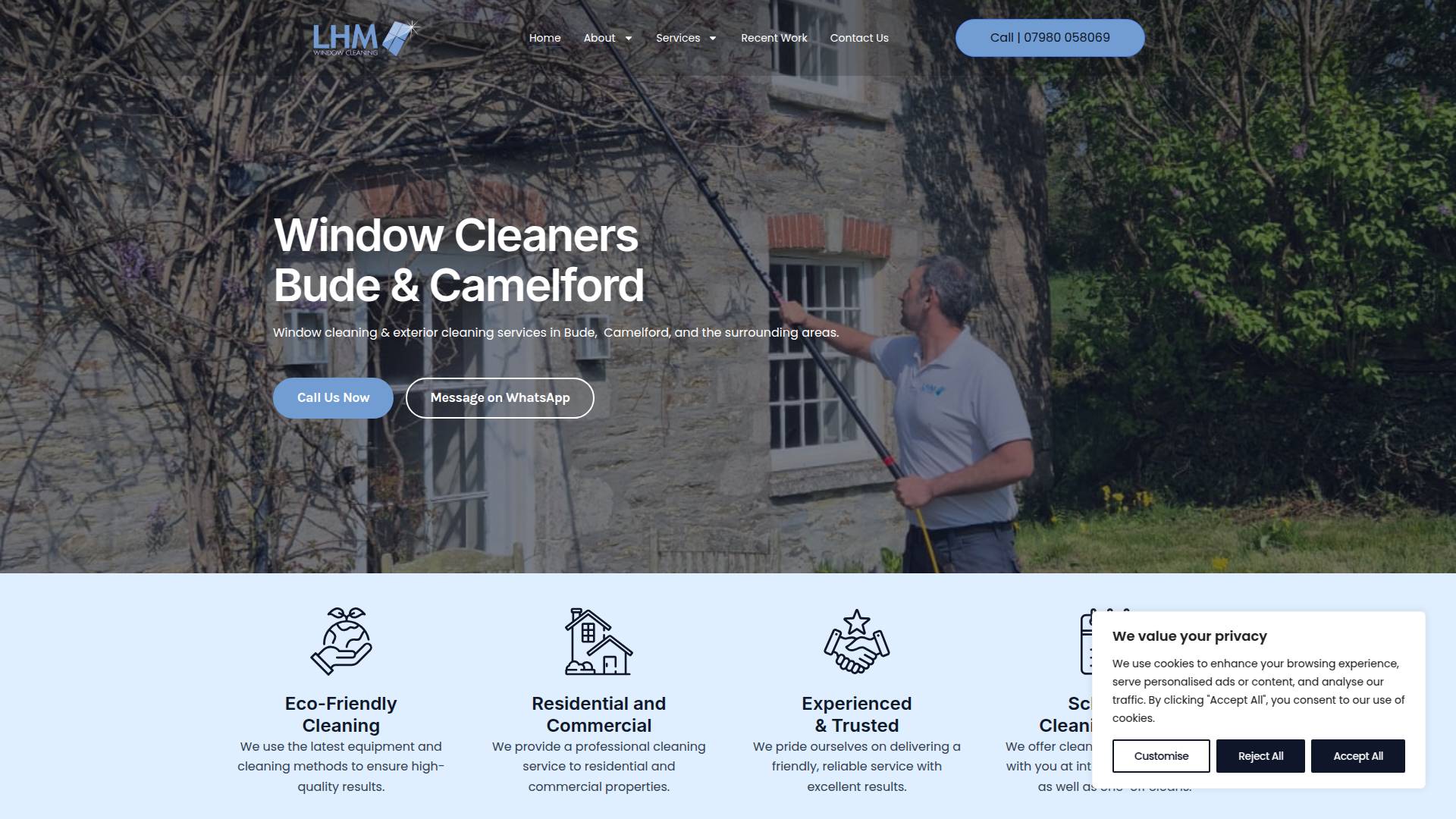 At LHM Window Cleaning, we provide professional, reliable, and eco-friendly window and exterior cleaning services across Bude, Camelford, and North Cornwall. With over 9 years of experience, we utilise advanced purified water-fed pole systems to deliver streak-free, sparkling clean results every time. Our comprehensive services include residential and commercial window cleaning, conservatory roof cleaning, solar panel maintenance, and UPVC fascia, gutter, and soffit cleaning. Fully insured and dedicated to excellence, we offer convenient cleaning schedules tailored to your needs, from regular maintenance to one-off cleans. Contact us today and see your property shine!