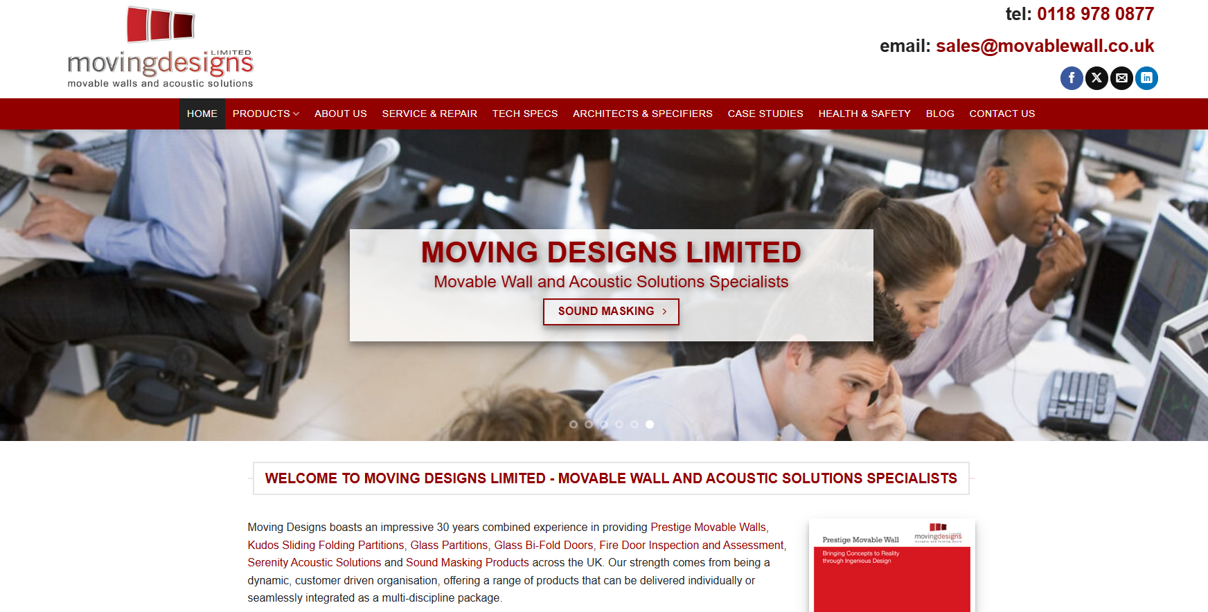 Moving Designs boasts an impressive 30 years combined experience in providing Prestige Movable Walls, Kudos Sliding Folding Partitions, Glass Partitions, Glass Bi-Fold Doors, Fire Door Inspection and Assessment, Serenity Acoustic Solutions and Sound Masking Products across the UK. Our strength comes from being a dynamic, customer driven organisation, offering a range of products that can be delivered individually or seamlessly integrated as a multi-discipline package.