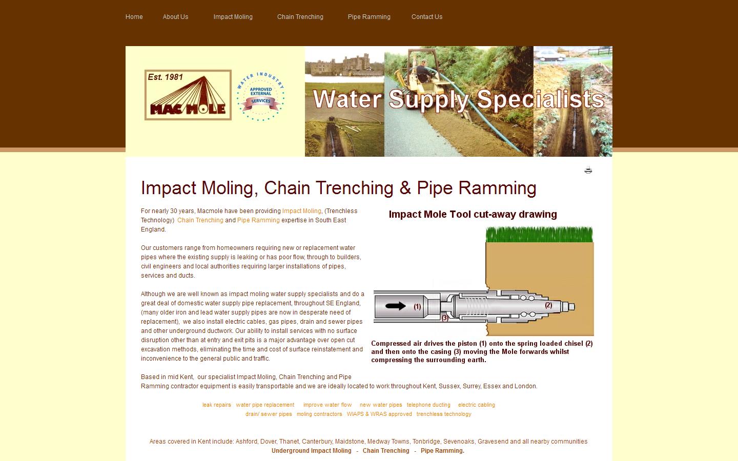 Formed in 1981, MacMole is a family-run company consisting of father, son and godfather. Together, our team has 86 years’ experience and has been providing reliable services for 40 years. As such, we are well-known as impact moling and water pipe replacement specialists, however we also undertake a range of other services, including the installation of gas pipes, electric cables and underground ductwork.