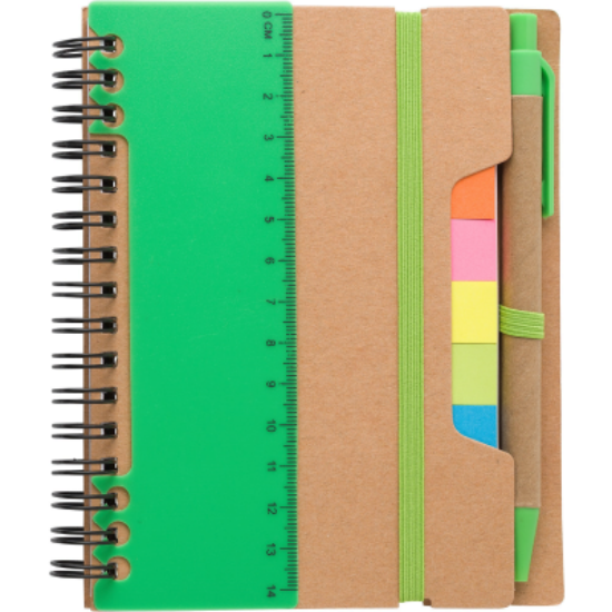 Spiral Wiro Bound Note Book with 60 Recycled Lined Pages, Five Colours of Sticky Notes, Ruler, Pen-Loop & a Ball Pen with Blue Ink.