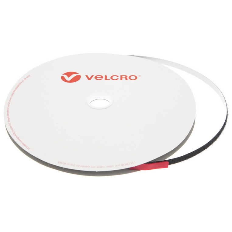 A 10mm wide VELCRO® brand stick-on hook (rough to the touch) tape with a rubber resin adhesive to the back, ideal for most surfaces, with the exception of PVC and anything containing plasticizers.