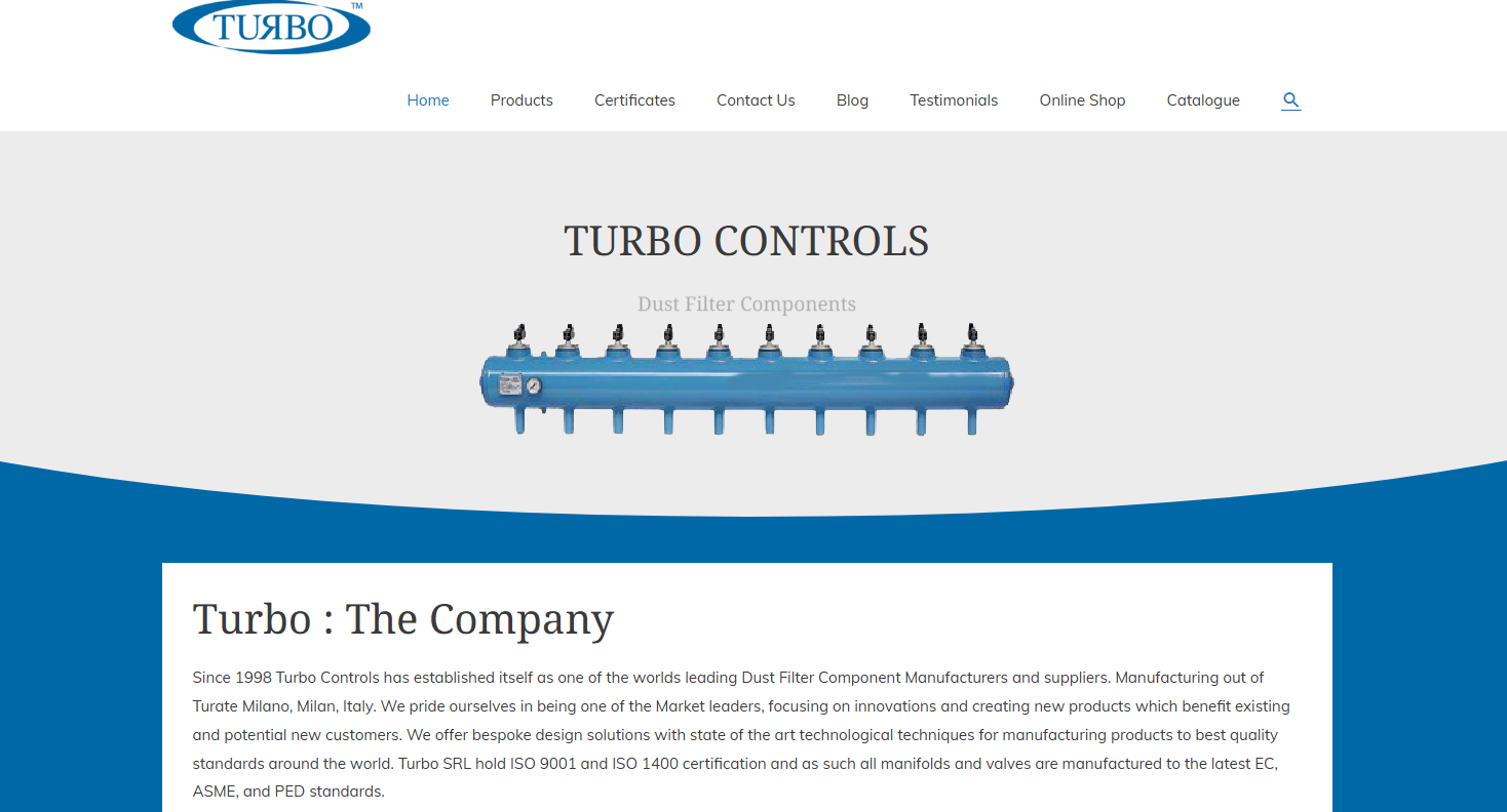 Since 1998 Turbo Controls has established itself as one of the worlds leading Dust Filter Component Manufacturers and suppliers. Manufacturing out of Turate Milano, Milan, Italy. We pride ourselves in being one of the Market leaders, focusing on innovations and creating new products which benefit existing and potential new customers. We offer bespoke design solutions with state of the art technological techniques for manufacturing products to best quality standards around the world. Turbo SRL hold ISO 9001 and ISO 1401 certification and as such all manifolds and valves are manufactured to the latest EC, ASME, and PED standards.