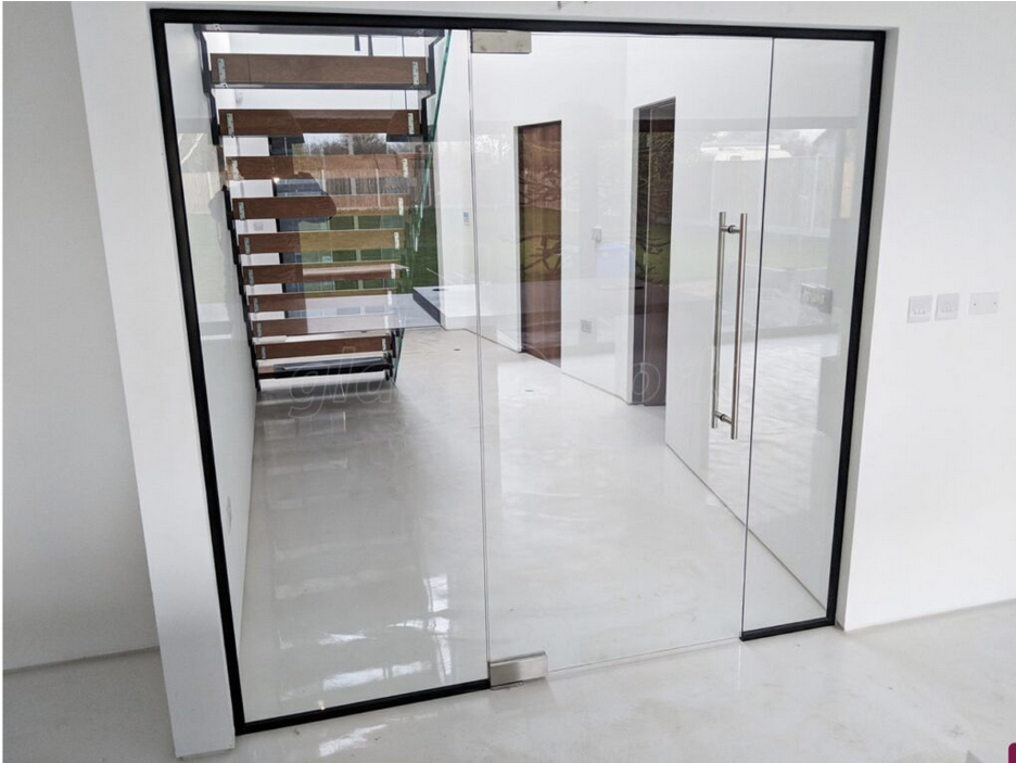 We supply and install frameless glass doors with either push/pull handles or with free swing or a variety of self closing mechanisms lever handles and locks. Doors can be supplied full height up to 3000mm or with an over panel and are installed with a free swing or a variety of self closing mechanisms, can be incorporated with our slimline aluminium door frame to enhance acoustic performance.