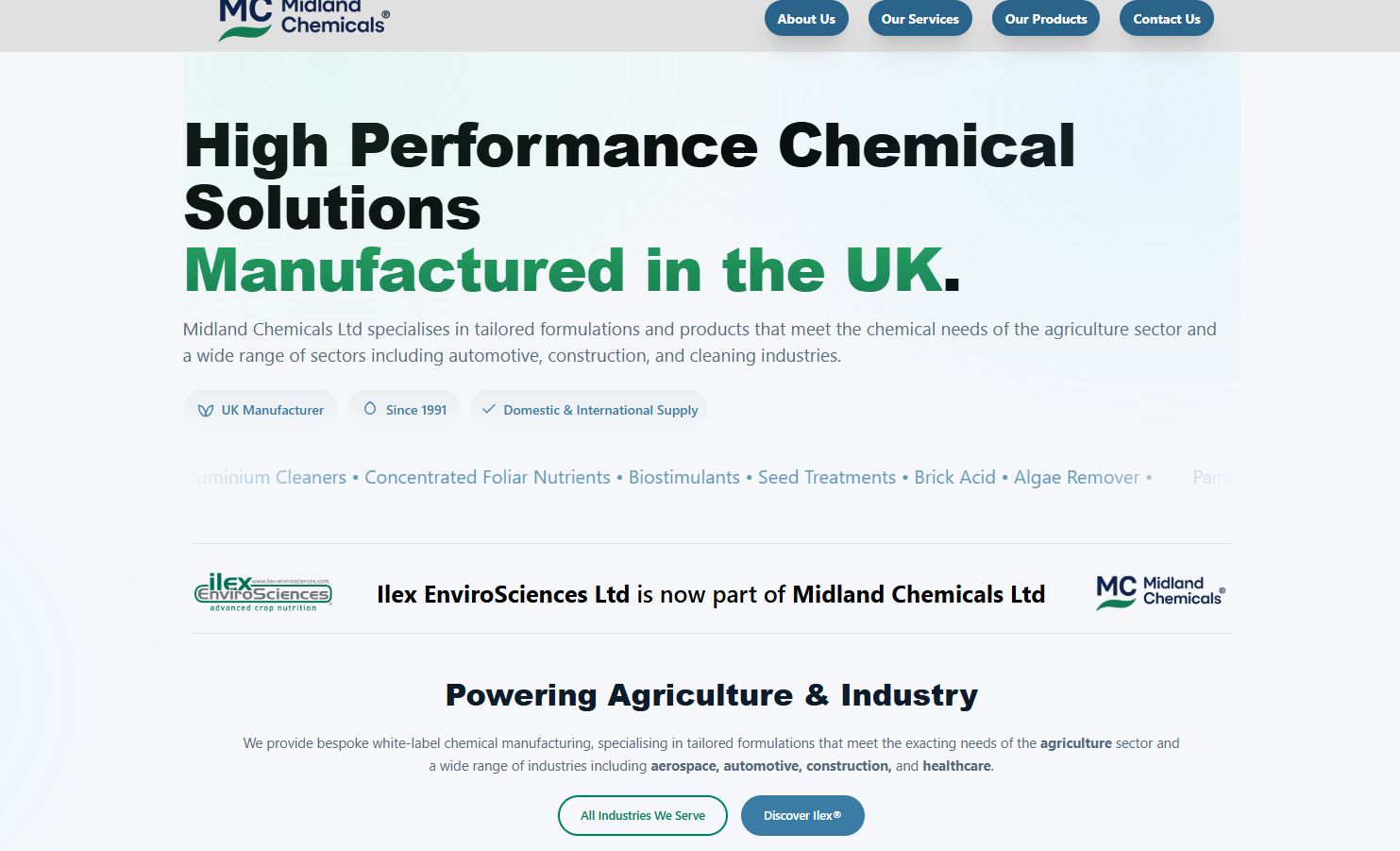 Midland Chemicals Ltd is a privately owned, independent UK manufacturer of chemicals established in 1991, based in Atherstone, Warwickshire, UK. Our reputation for producing high-quality products and a high level of technical support has led to us supplying to customers throughout the UK, Europe, and worldwide.