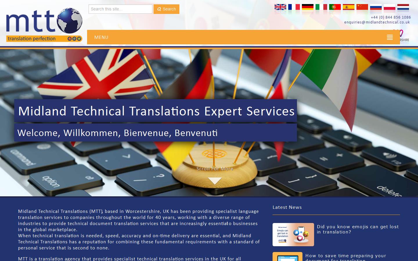Founded in 1983 and based in the Worcestershire, Midland Technical Translations is a professional language services company providing a range of translation, interpreting, voiceover and localisation services to customers around the world. MTT works exclusively with native speakers of all languages to provide accurate translation services for a range of industry sectors. MTT's commitment to excellence is certified through our membership of the Institute of Translation and Interpreting, and the Chartered Institute of Linguists and also by the Quality Management standard ISO 9001:2000 which recognises our commitment to maintaining high quality and service standards. We pride ourselves on our friendly and professional service and our unique triple guaranteed service.