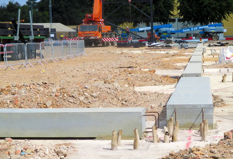 Precast concrete ground beams are faster to install than on-site alternatives due to off-site manufacturing, enabling concurrent work on-site and reducing the need for on-site casting and curing. Their quality control in a controlled factory environment minimises defects and rework, while the assembly process involves fewer labour-intensive activities.