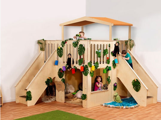 The play and learning possibilities are endless with this versatile playhouse. The structure is quickly and easily transformed to create different role play environments such as a home corner, hospital, school or jungle. There are also plenty of areas where children can enjoy quiet play, or create a cosy nook for reading and relaxation. The sturdy structure is made from premium birch plywood cladding and is supported by a tubular steel frame for supreme structural performance. The guard rails around the upper level platform have safety plastic on the reverse.